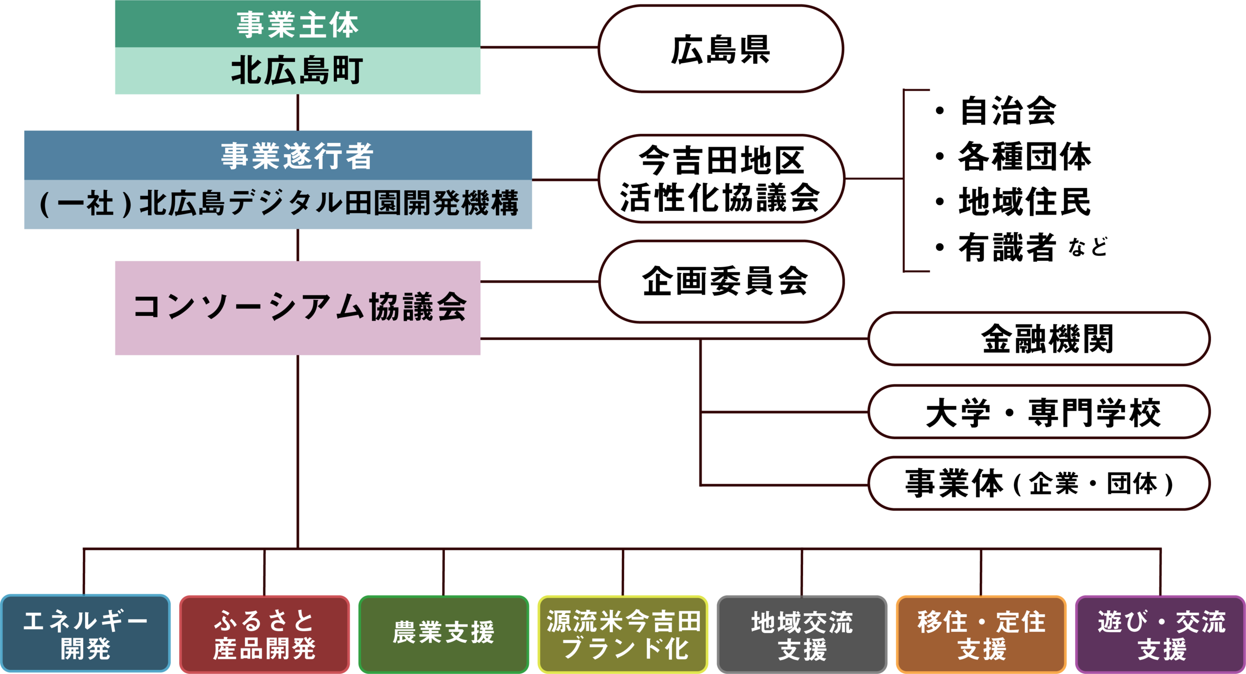 今吉田地域およびグリーンビレッジを拠点とし、北広島町内外の各種団体と連携して、「産官学金民一体」となってプロジェクトを推進します。