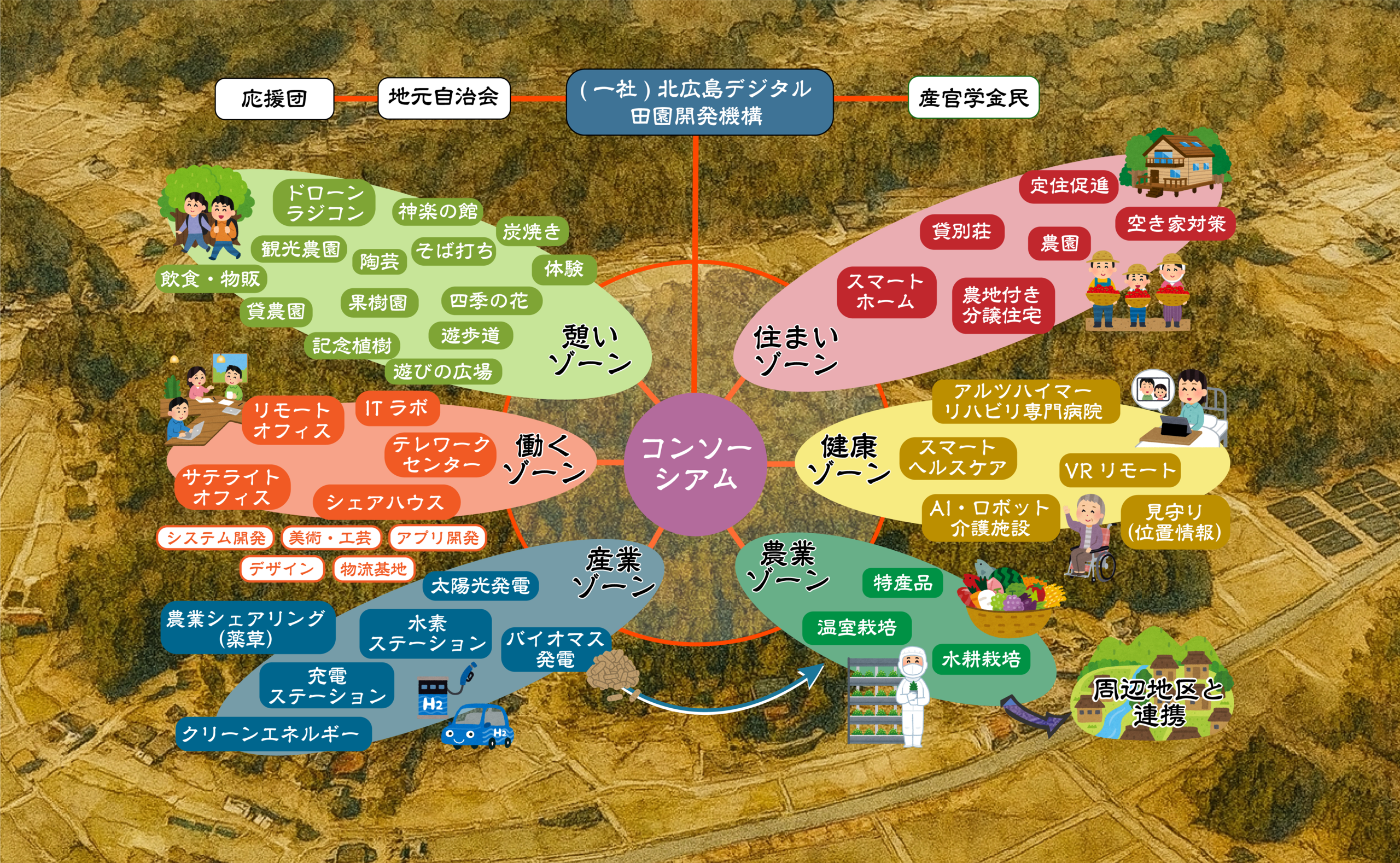 私たちは、以前工業団地の建設が予定されていた広島県有地約17ヘクタールの売却、取得を契機として、この地域の活性化を目指し設立しました。